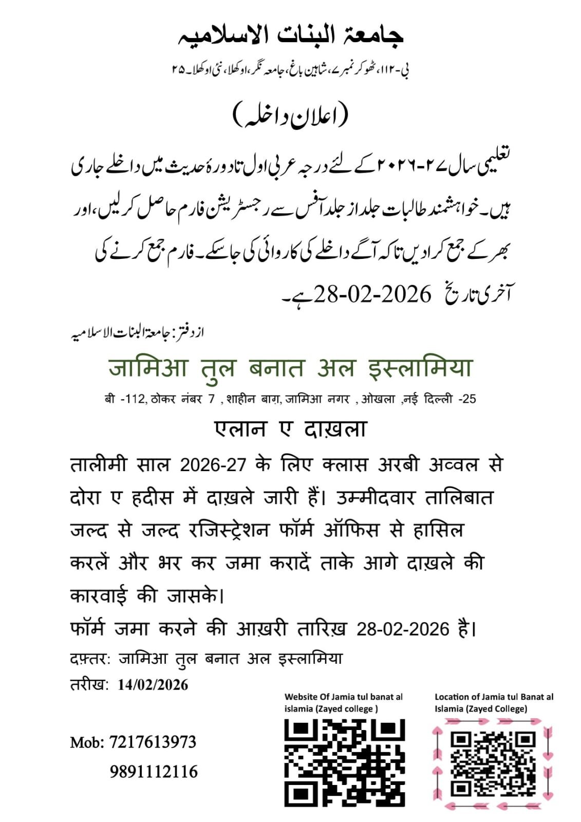 Jamia Millia Islamia has officially certified that the Alimiat qualification from Jamiatul Banat Al-Islamia, Jamia Nagar, New Delhi, is equivalent